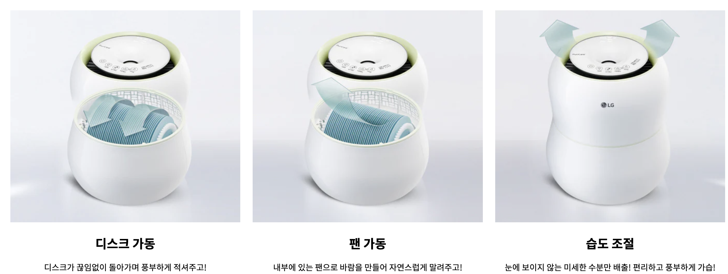 장점: 바람으로 말려 주변 습도를 조절하는 방식을 사용하기 때문에 다른 방식에 비해 관리가 쉽습니다.